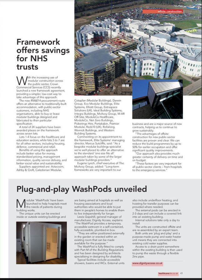 July 24, 2019 News The latest issue of Healthcare Design & Management features the launch of WashPod with the view that they will help hospitals meet the needs of patients during building works as a Plug & Play modular unit. Previous Post Newer Post